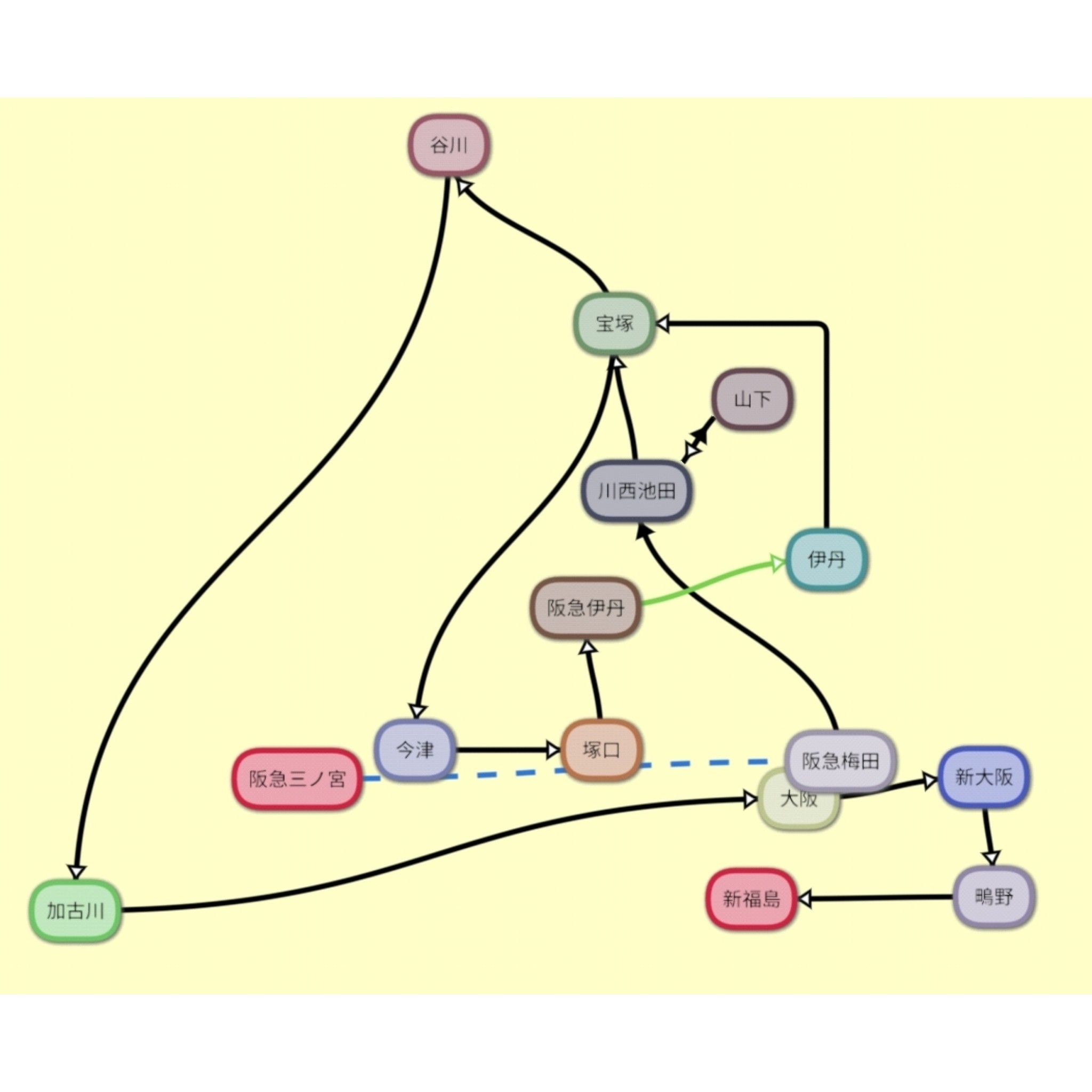 阪急梅田→川西池田→山下→折り返し→山下→川西池田→阪急宝塚→西宮北口→塚口→阪急伊丹