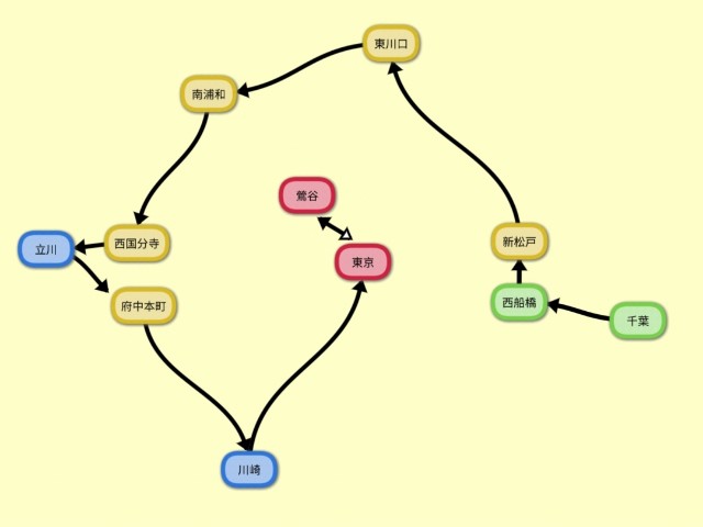 千葉→西船橋→西国分寺→立川→川崎→(東京)→鶯谷→休憩→東京